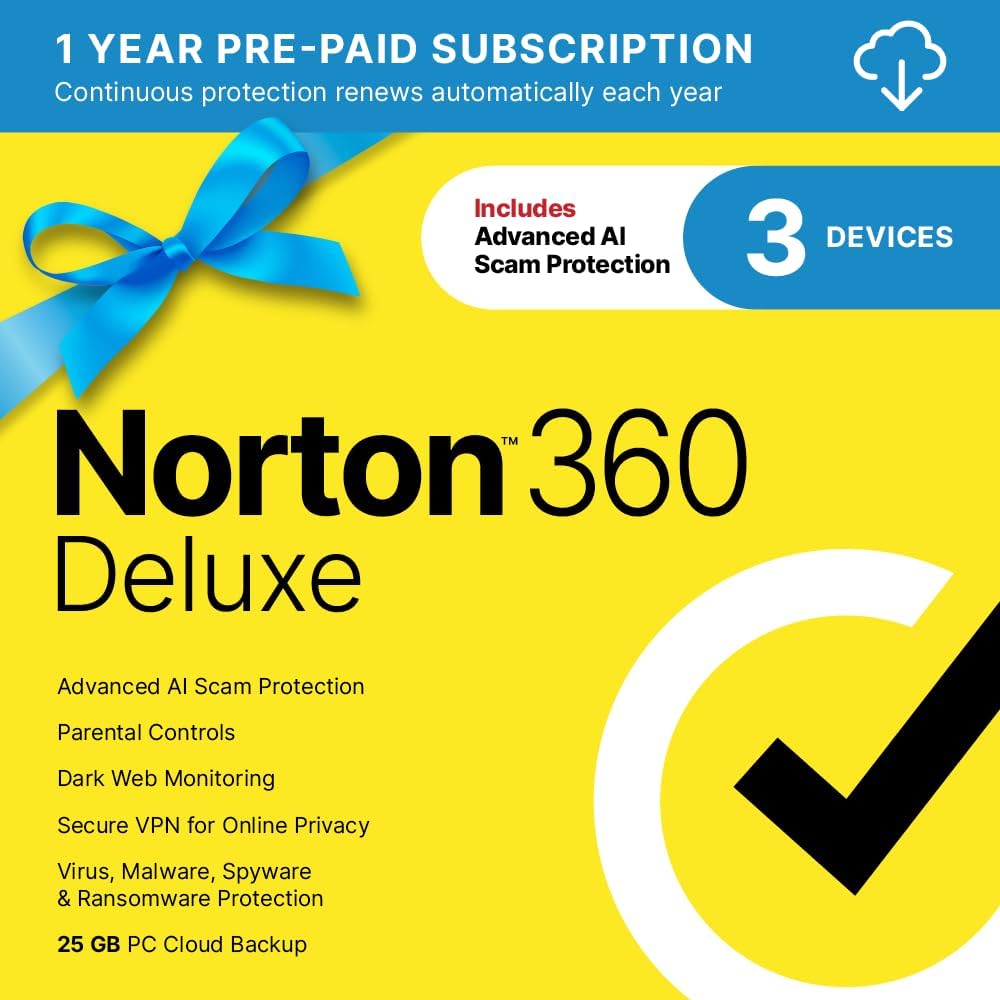 Symantec Norton 360 Deluxe - Version boîte (1 an) - 3 périphériques, Espace de Stockage de Cloud 25 GB - Mass Market - Win, Mac, Android, iOS - français